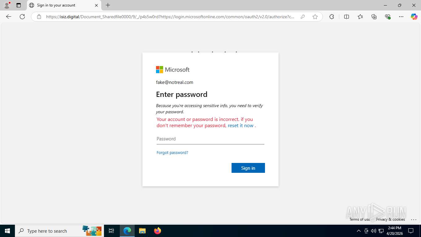 To confirm what was happening, we entered fake credentials into the phishing page from within the sandbox. After submitting them, the site behaved exactly like a real Microsoft 365 login: it rejected the credentials and displayed an “incorrect password” message.