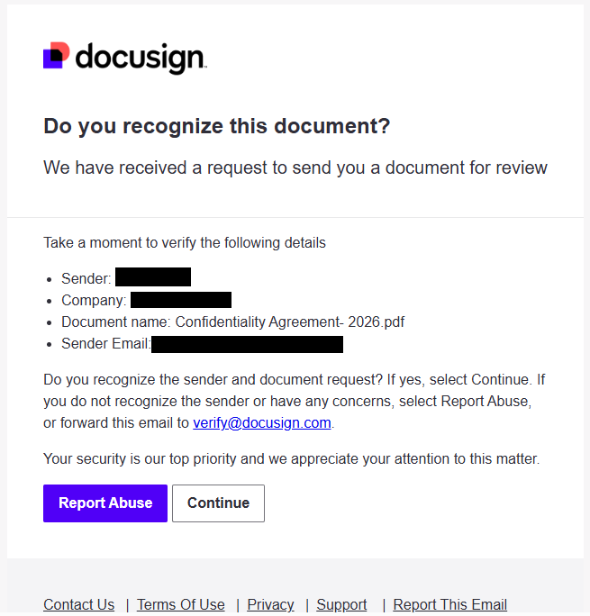 The attack started with a legitimate DocuSign notification email sent to the victim. The message looked routine: a confidentiality agreement to review and sign, coming from what appeared to be a normal business contact.