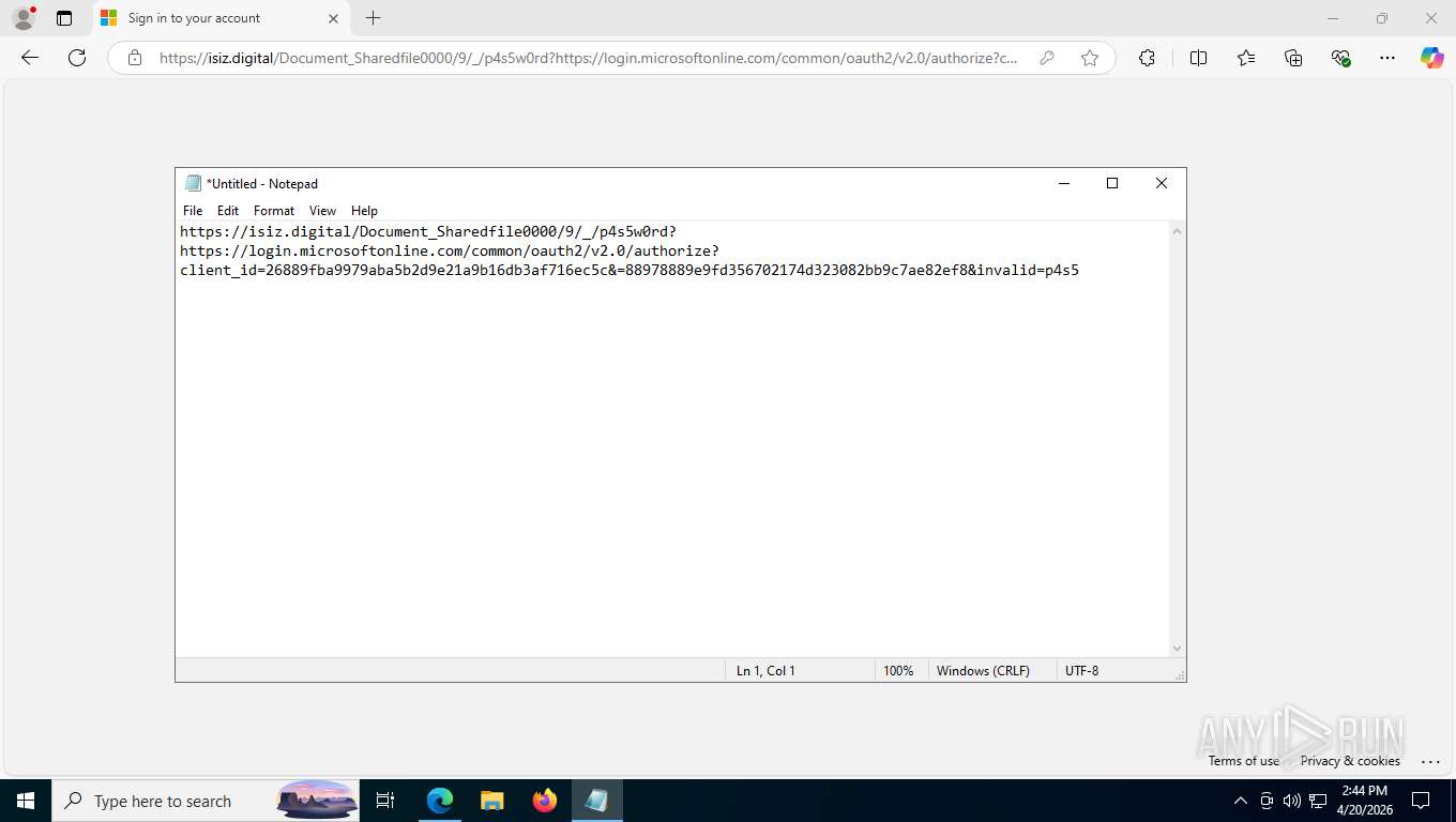 This attack also abused Microsoft OAuth URLs as part of the redirect chain, which is a known tactic for hiding malicious AiTM links behind otherwise legitimate‑looking Microsoft authorization flows.